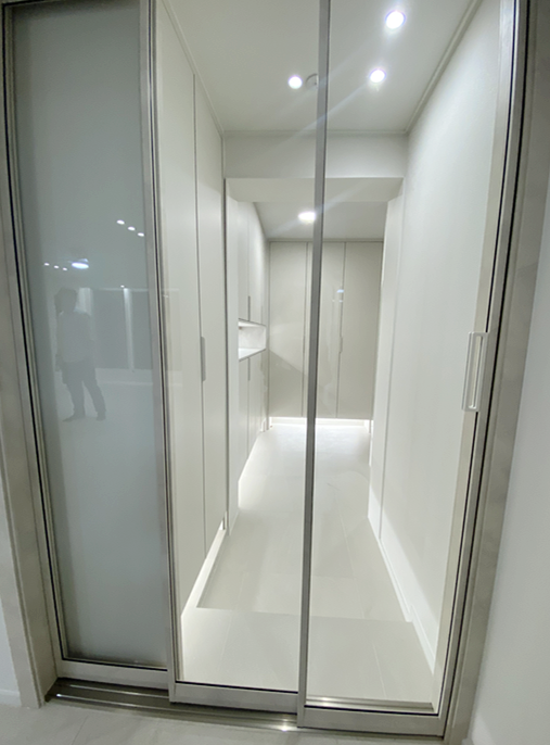 현관도 서비스 공간이 있어서 펜트리 구성해서 장을 짰더니, 온갖 짐이 다 들어갈 만큼 컸습니다. 주방 베란다도 넓어서, 세탁기 + 보조주방 + 분리수거함 등이 다 들어가도 될 만큼 매우 넓습니다.